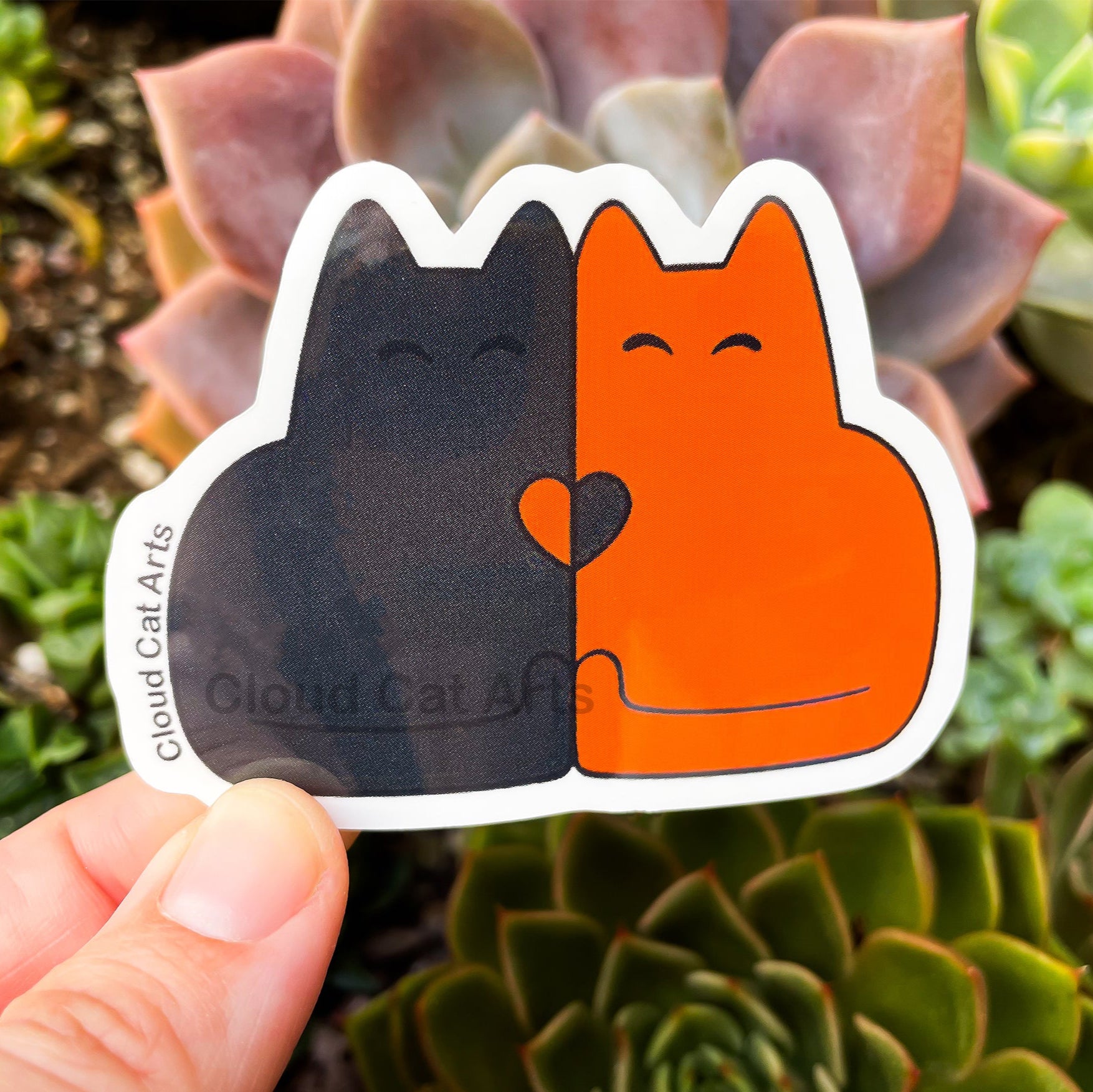 Two cats sharing heart sticker. Cute kawaii black and orange cat friendship design. Perfect for cat lovers, best friends, and couples!